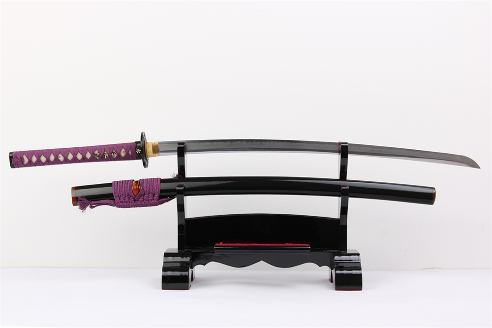 鞘材:實(shí)木黑亮光漆三個黑牛角,繞紫色真絲帶