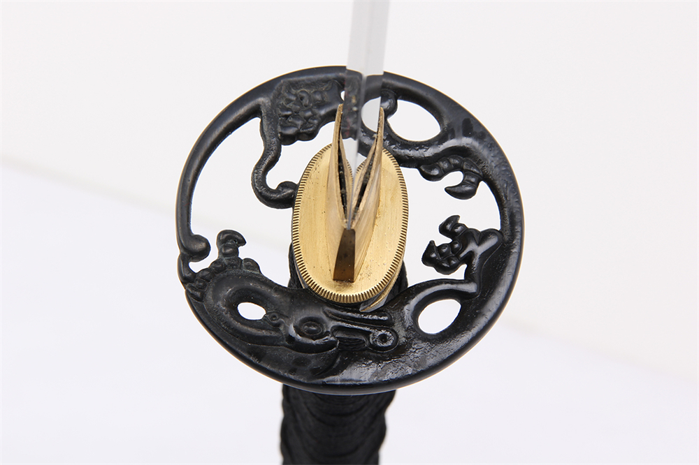 鞘材:實木黑亮光漆貼銅花三個黃牛角 繞黑色真絲帶