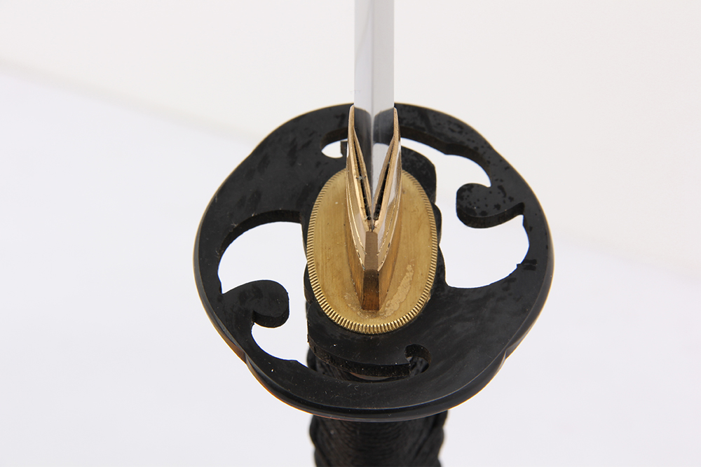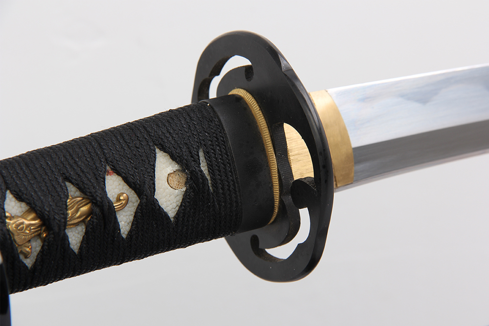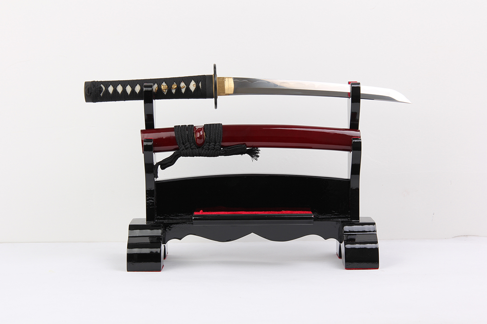 鞘材:實木半透明酒紅漆三個黑牛角 繞黑色真絲帶