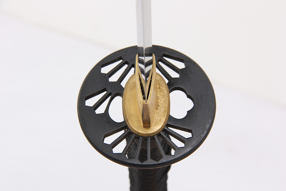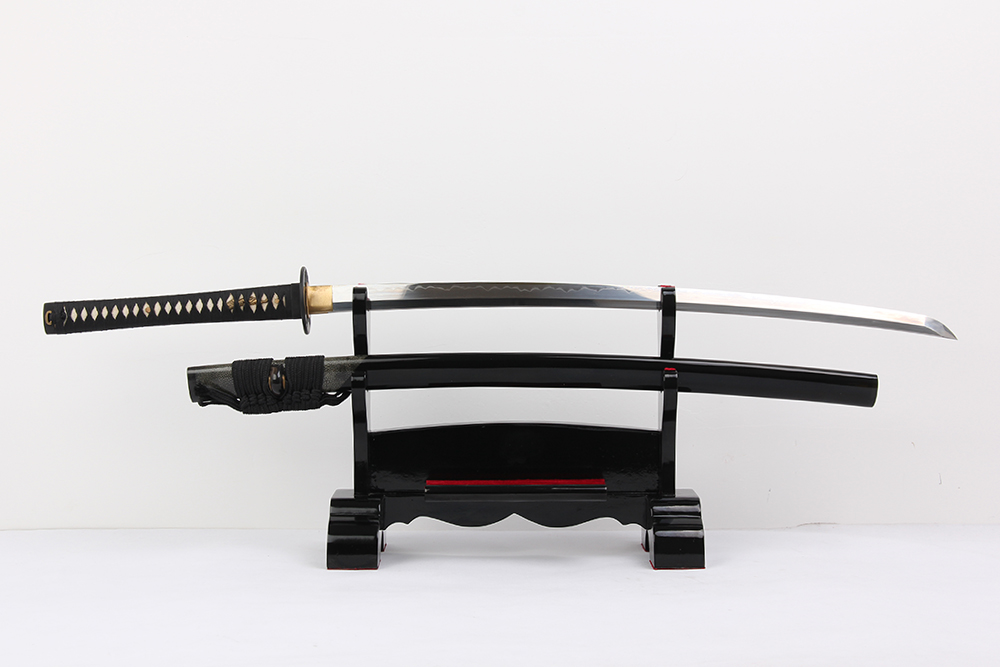 鞘材:實木黑亮光漆包半截黑魚皮三個黑牛角 繞黑色真絲帶