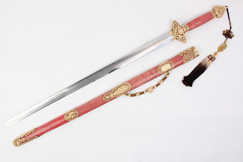全長(zhǎng):103CM 刃長(zhǎng):77CM 柄長(zhǎng):23CM 劍身: 1095鋼刀鞘:紅色鯊魚(yú)皮裝具:銅鏤空包裝:木錦盒