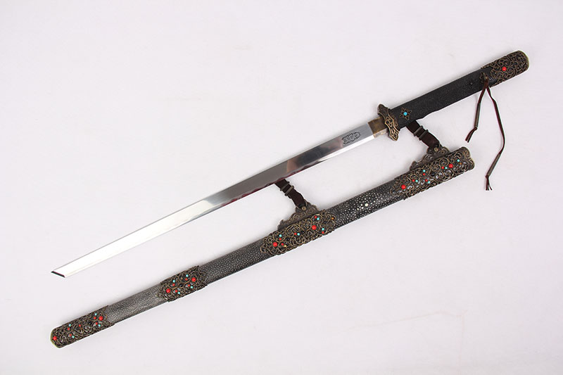 鄭氏刀劍鍛造唐刀,取精用宏前人傳承的優(yōu)良工藝。此刀,使用手工歷鍛、鏟、銼、刻、淬、磨等28道工序精制而成,全長110厘米,柄長27厘米,刃長70厘米,重1.84千克。直背扁平刀身切刃造,刃文細(xì)直呈纏連木紋狀。折邊刀鐔融承漢刀風(fēng)格造型。木胎刀柄、刀鞘外覆鯊魚皮,再銅裝其體鏤雕飛云、花卉、唐草,并鑲嵌紅、藍(lán)、黑、黃四色珠寶裝飾。