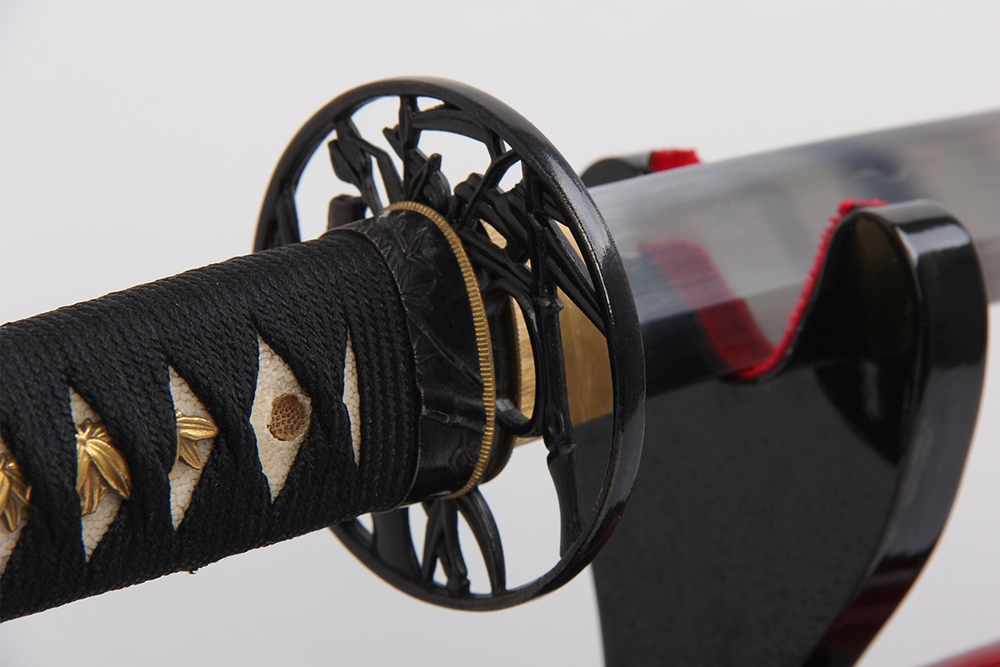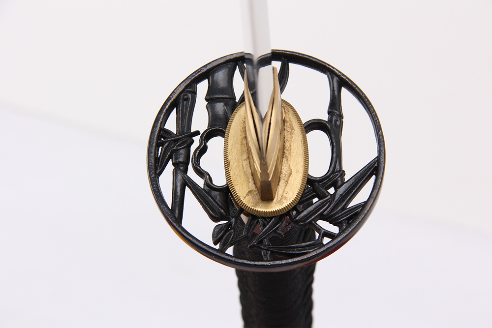 鞘材:實木半透明酒紅漆鑲貝鴛鴦荷葉圖三個黑牛角 繞黑色真絲帶