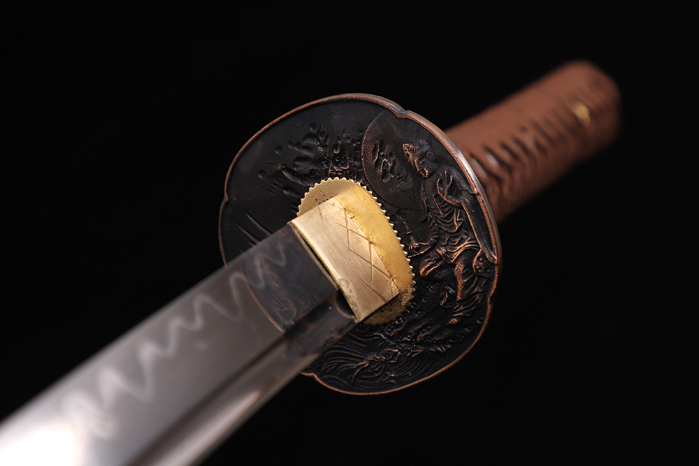 28寸高檔手工刀全長:104cm 刃長:68cm 柄長:28cm刃材:1045鋼燒刃全槽有切線快口柄材:實(shí)木 繞棕色帶+真魚皮鞘材:實(shí)木紅底金粉三圈黑 繞咖啡間黃真絲帶配件:銅包裝:黑龍布木盒裝帶黑布袋