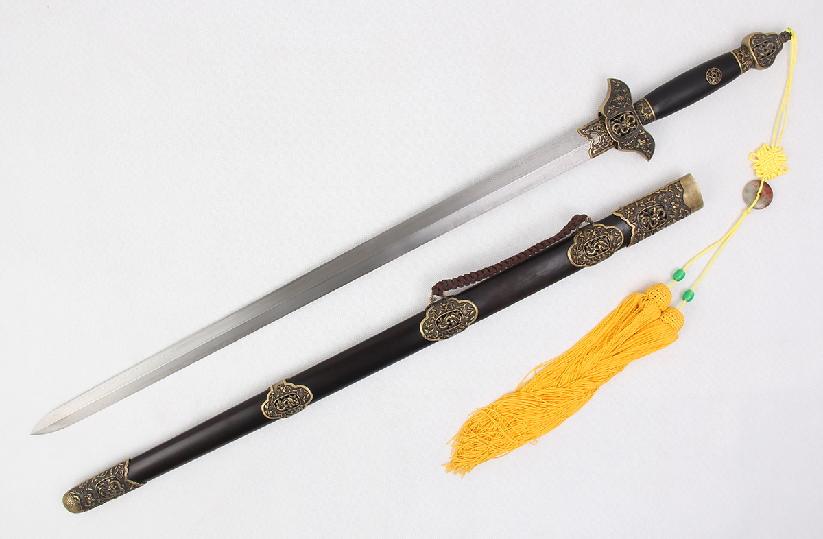 全長(zhǎng):103CM 刃長(zhǎng):77CM 柄長(zhǎng):23CM 劍身: 百煉花紋鋼刃刀鞘:黑檀木裝具:全銅 銅黑包裝:木錦盒