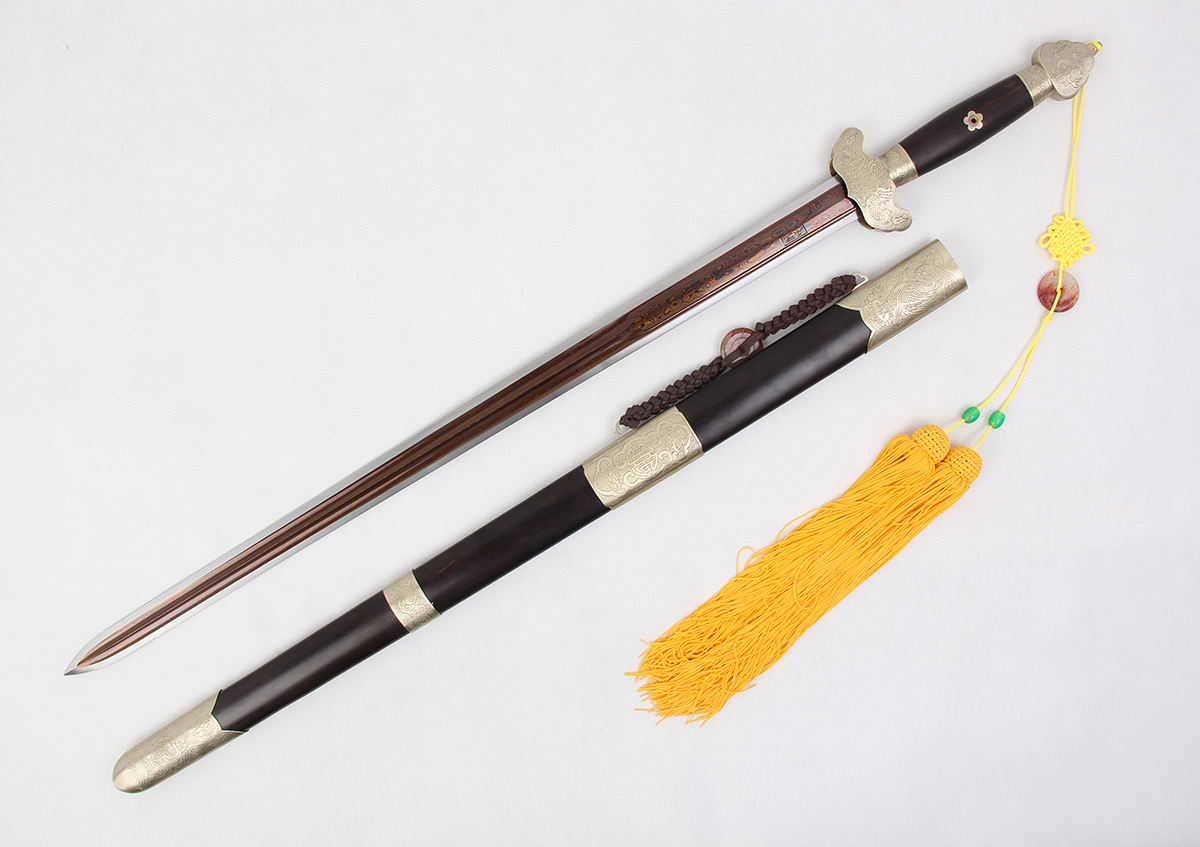全長(zhǎng):103CM 刃長(zhǎng):77CM 柄長(zhǎng):23CM 劍身: 花紋鋼發(fā)紅刀鞘:黑檀木裝具:手工包銅 手工刻花包裝:木錦盒
