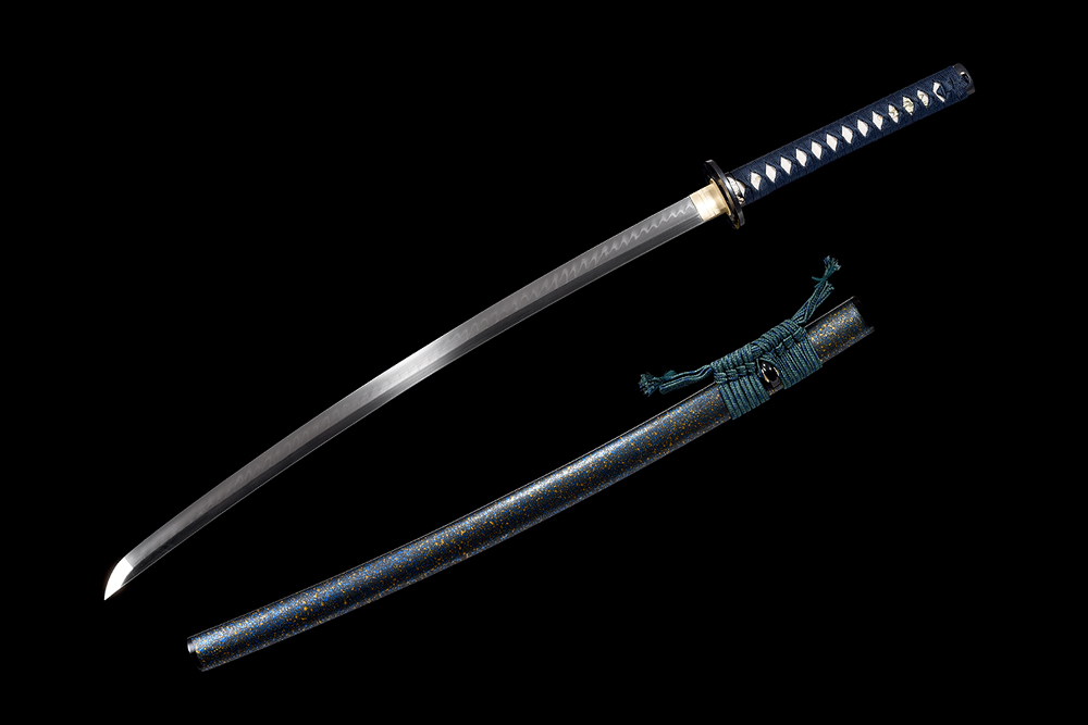 28寸手工刀全長:104cm 刃長:68cm 柄長:28cm刃材:1095鋼燒刃無槽有切線柄材:實木 繞藍(lán)色羊毛帶+真魚皮鞘材:實木亞光底藍(lán)點加金點三全黑 繞綠間藍(lán)真絲帶配件:銅+鋅合金包裝:雙瓦紙盒