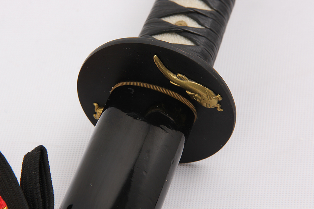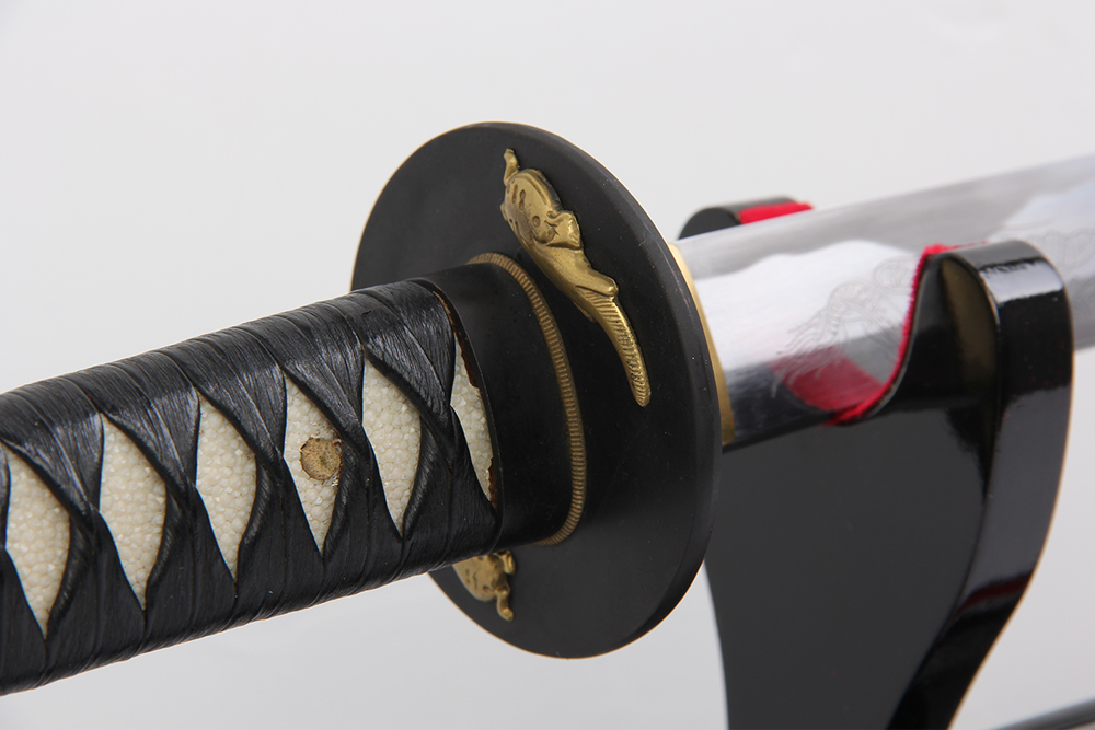 28寸手工刀全長:104cm 刃長:68cm 柄長:28cm刃材:不銹鋼熱處理 反面開雙槽正面手工爛龍柄材:實木 繞黑豬皮+真魚皮鞘材:實木黑亮光漆 繞黑色帶配件:銅+鋅合金包裝:紅龍布盒裝外加雙瓦紙內盒 帶黃龍布袋