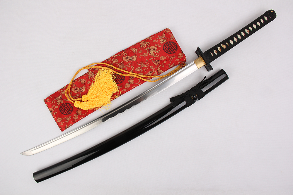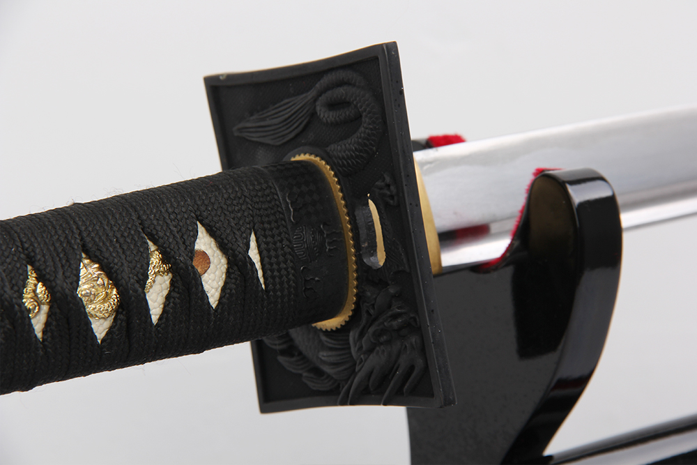 28寸手工刀全長:104cm 刃長:68cm 柄長:28cm刃材:1045鋼全槽有花口有切線柄材:實木 繞黑色帶+仿魚皮鞘材:實木黑亮光漆 繞黑色帶配件:銅+鋅合金包裝:黑彩盒 帶黑布袋