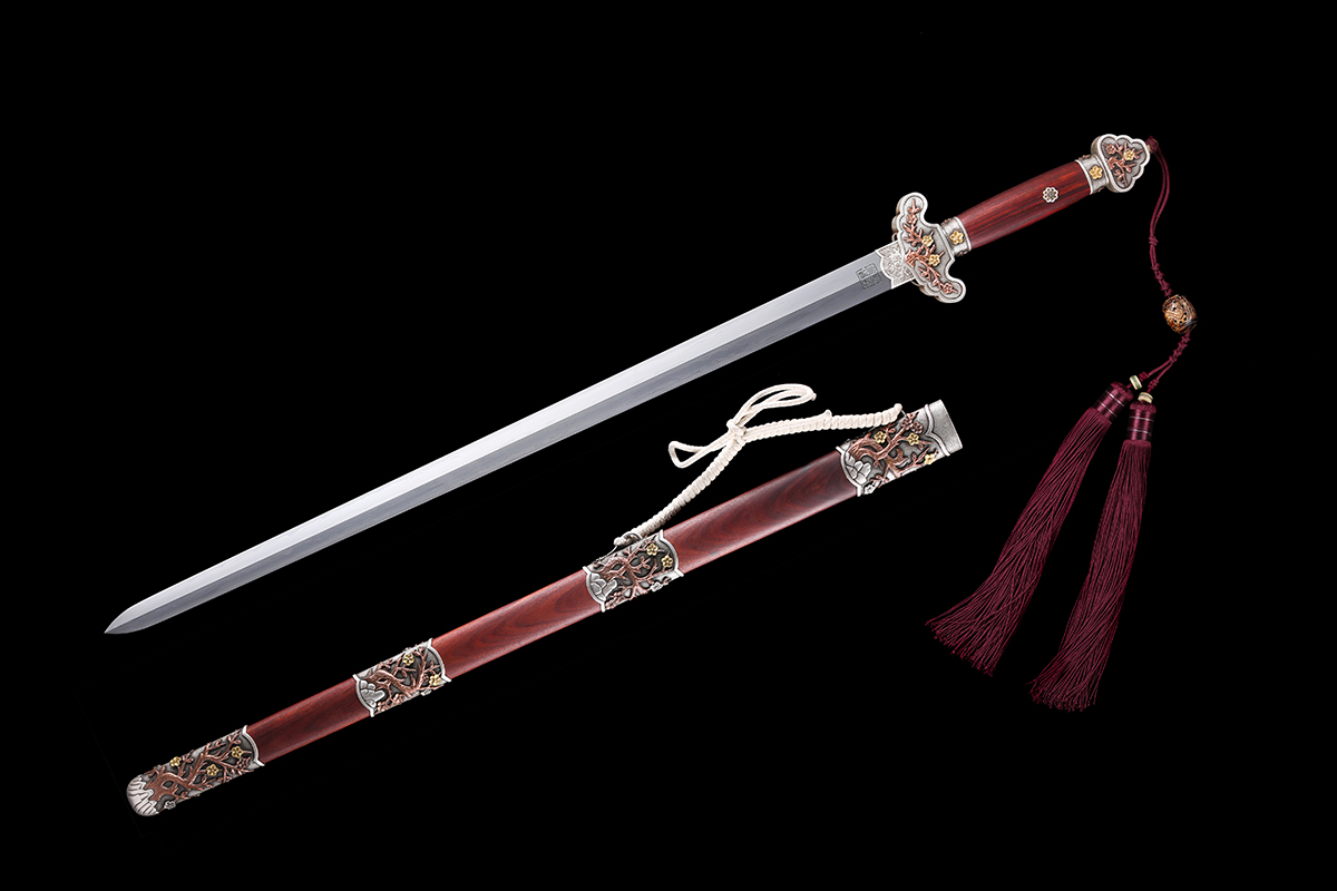 “寶劍鋒從磨礪出,梅花香自苦寒來”。此劍,是以上等花紋鋼、紫銅,天然蛇紋木、魚皮等為材料,取樣清劍風(fēng)貌,采用傳統(tǒng)手工技藝,歷鍛、鏟、銼、刻、磨……等28道工序精制而成。全長(zhǎng)105厘米,柄長(zhǎng)23 厘米,刃長(zhǎng)76 厘米,刃寬3.5厘米,重量2.2千克。劍身,以錨鐵夾鋼經(jīng)百煉鍛造后,鍔成鋒銳,剛?cè)岵⒃?,寒光逼人,其劍面四向錯(cuò)落有致、蜿蜒如練的流水紋,似四灣溪水從劍格處直瀉劍尖,靈動(dòng)出巧,妙趣天成。其如意形劍格、葫蘆式劍首、橢圓徑長(zhǎng)狀劍鞘上以50余克黃金、600余克白銀浮雕梅花如星辰般布列裝飾,意蘊(yùn)著花開富貴喜盈門,事業(yè)昌盛財(cái)源旺之福祿如意景觀,使整劍于婉約典雅中見端莊大氣,于豪放恢宏間彰顯人文與自然兩相宜之富麗高貴氣象。