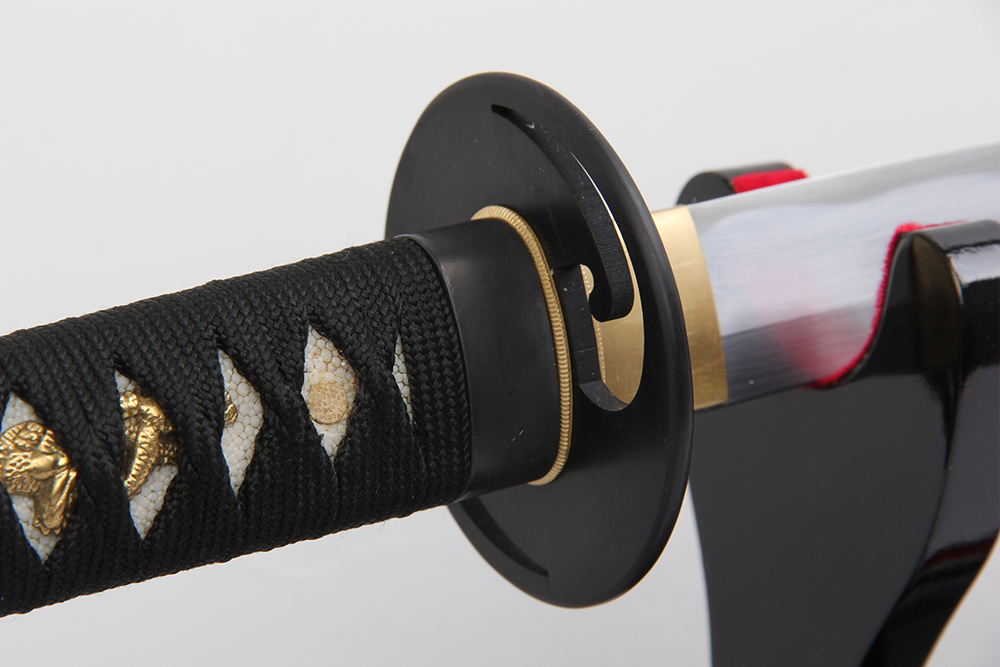 28寸手工刀全長:104cm 刃長:68cm 柄長:28cm刃材:1045鋼無槽有花口有切線柄材:實木 繞黑色帶+真魚皮鞘材:實木黑亮光漆 繞黑色帶配件:銅+鋅合金包裝:黑彩盒 帶黑布袋