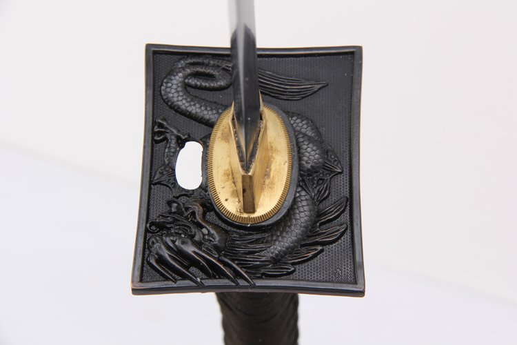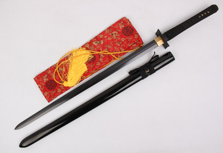 28寸手工劍 直款全長:104cm 刃長:68cm 柄長:28cm刃材:百煉花紋鋼發(fā)黑開單支血槽無花口柄材:實(shí)木 繞黑色帶+真魚皮鞘材:實(shí)木黑亮光漆 繞黑色帶配件:銅+鋅合金包裝:黑彩盒 帶黑布袋