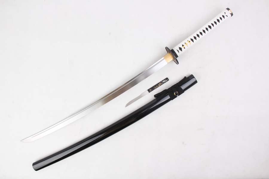 28寸手工刀全長(zhǎng):104cm 刃長(zhǎng):68cm 柄長(zhǎng):28cm刃材:1045鋼無(wú)槽有花口 腹刀不銹鋼柄材:實(shí)木 繞白色帶+真魚(yú)皮鞘材:實(shí)木黑亮光帶腹刀插槽 繞黑色帶配件:銅+鋅合金包裝:黑彩盒裝 帶黑布袋