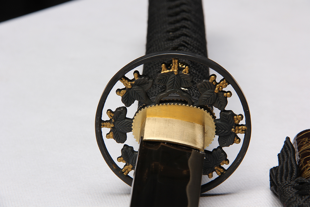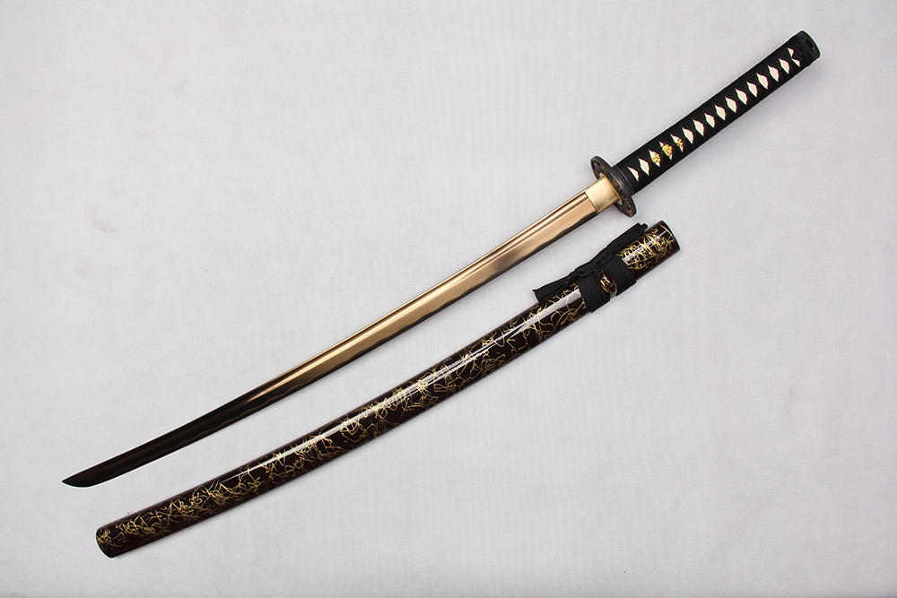28寸手工刀全長(zhǎng):104cm 刃長(zhǎng):68cm 柄長(zhǎng):28cm刃材:1045鋼有槽電鍍金色有花口有切線柄材:實(shí)木 繞黑色帶+仿魚(yú)皮鞘材:實(shí)木深咖色拉金絲 繞黑色帶配件:鋅合金包裝:雙瓦紙盒 帶黑布袋