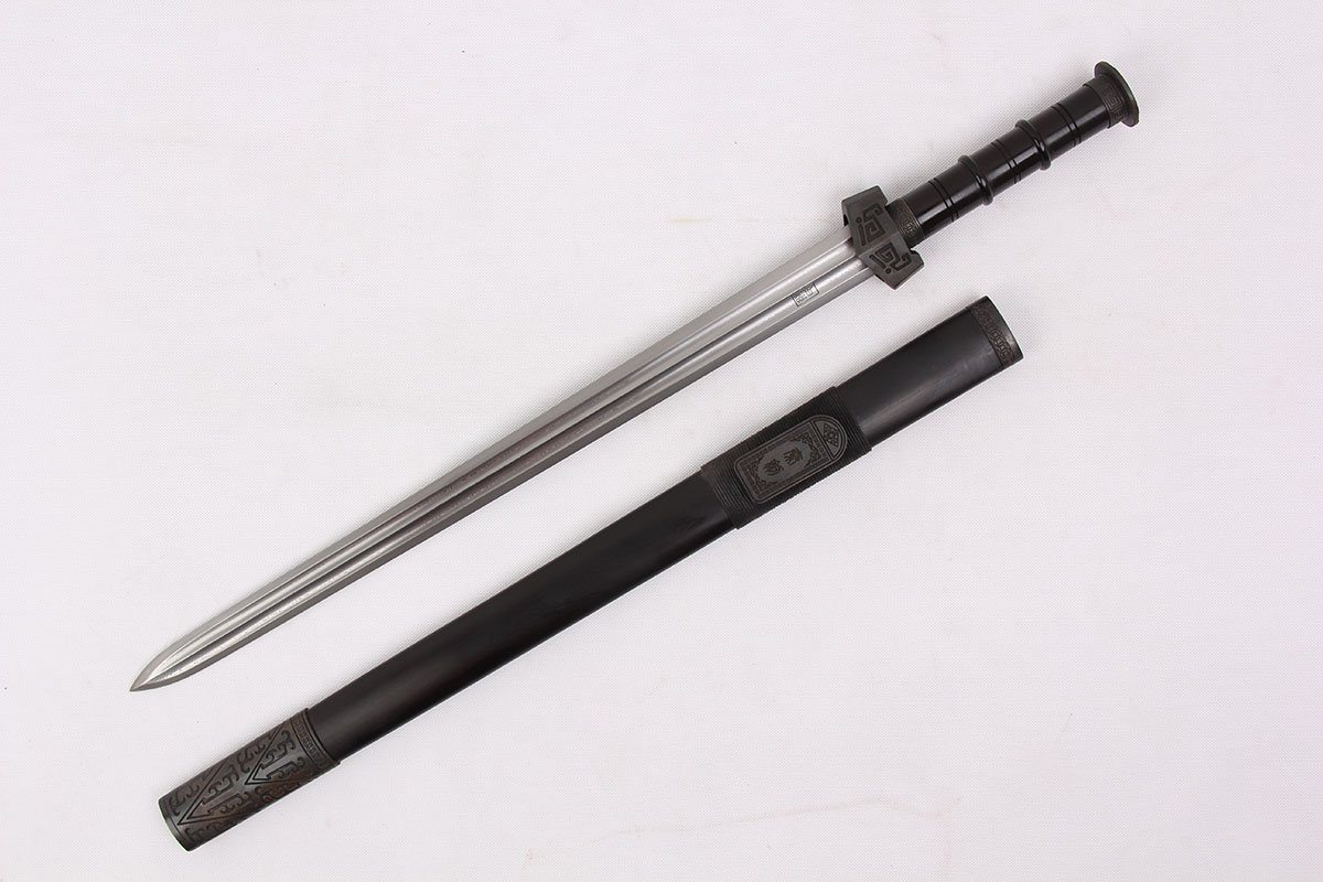 全長: 75CM 刃長: 54CM 柄長:15CM 劍身: 百煉花紋鋼刀鞘:黑檀木裝具:銅黑包裝:錦盒