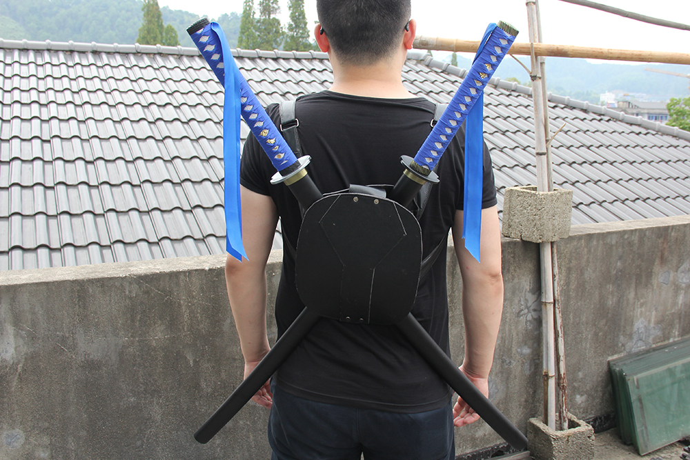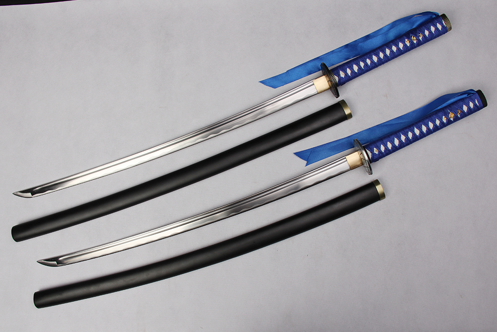 28寸忍者神龜雙刀 手工刀全長:104cm 刃長:68cm 柄長:28cm刃材:1045鋼有槽有花口有切線柄材:實木 繞寶藍帶+仿魚皮(系寶藍飄帶)鞘材:實木亞光黑漆 繞寶藍帶配件:鋅合金包裝:雙瓦紙盒