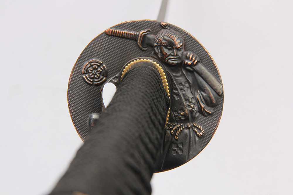 28寸手工刀全長(zhǎng):104cm 刃長(zhǎng):68cm 柄長(zhǎng):28cm刃材:1045鋼有槽有花口有切線柄材:實(shí)木 繞黑色帶+真魚(yú)皮鞘材:實(shí)木黑亮光激光刻長(zhǎng)條花上金粉 繞黑色帶配件:銅+鋅合金包裝:雙瓦紙盒 帶黑布袋