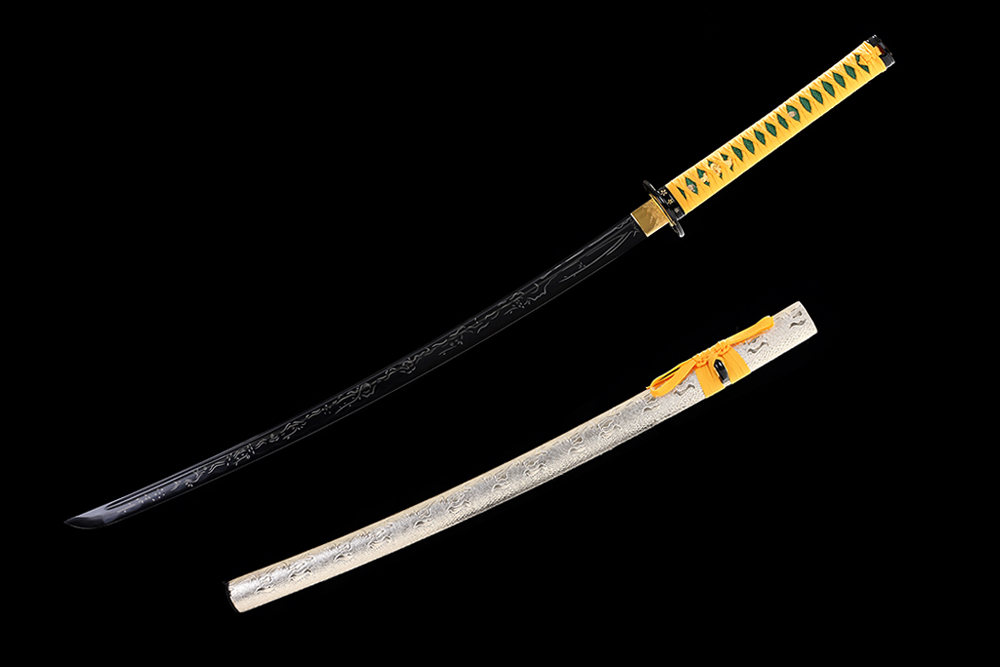 28寸手工刀全長:104cm 刃長:68cm 柄長:28cm刃材:1045鋼發(fā)黑全槽有切線有花口 激光刻花柄材:實(shí)木 繞桔黃帶+仿魚皮鞘材:實(shí)木包仿金色蟒蛇 繞桔黃帶配件:鋅合金包裝:雙瓦紙盒 帶黑布袋