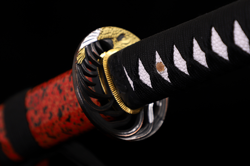 28寸手工刀全長(zhǎng):104cm 刃長(zhǎng):68cm 柄長(zhǎng):28cm刃材:1045鋼全槽有花口有切線柄材:實(shí)木 繞黑色帶+仿魚(yú)皮鞘材:實(shí)木黑亮光加紅黑金三色斜口兩圈黑 繞黑色帶配件:鋅合金包裝:雙瓦紙盒 帶黑布袋