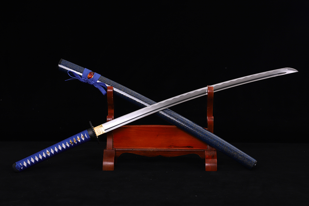 28寸手工刀全長:104cm 刃長:68cm 柄長:28cm刃材:1045鋼全槽有花口有切線柄材:實木 繞寶藍帶+仿魚皮鞘材:實木深藍加金兩圈黑水晶鼻 繞寶藍帶配件:鋅合金包裝:雙瓦紙盒 帶黑布袋